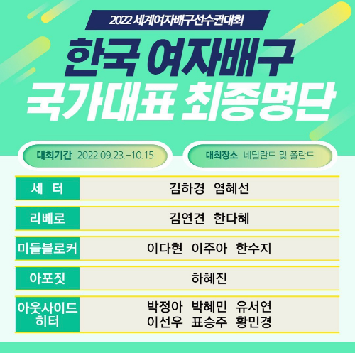 가장 최근에는 박은진 선수가 발목 부상으로 낙마하고, 한수지 선수가 대체 발탁되는 등 부상 선수가 계속 발생하고, 그에 따라 선수들도 바뀌는 등 쉽지 않은 경기가 될 것이라는 평가가 많지만 평균 25.8세로 젊어진 여자 배구 국가대표팀이 보여줄 경기에 대해 기대를 걸어봅니다.