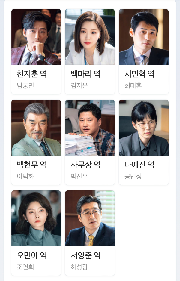 | 제작사 스튜디오S 기획 이광순 연출 김재현, 신중훈 극본 최수진, 최창환 프로듀서 서균 출연 남궁민, 김지은, 최대훈, 이덕화, 박진우 |