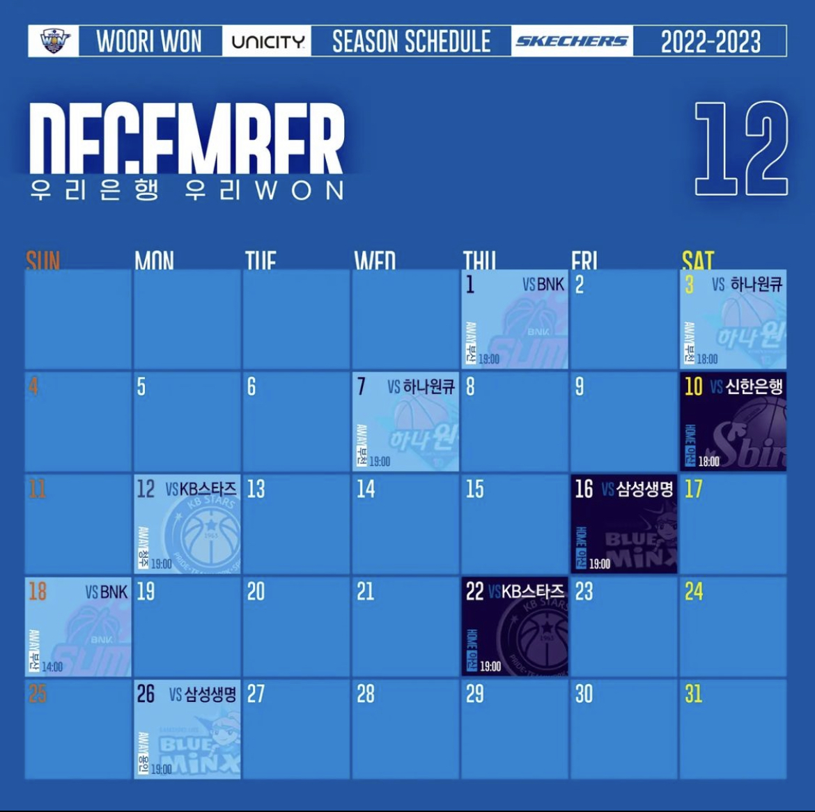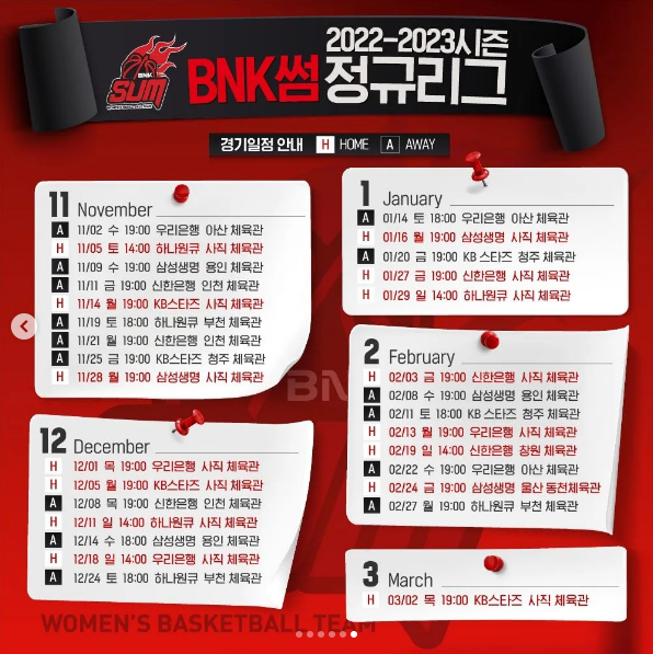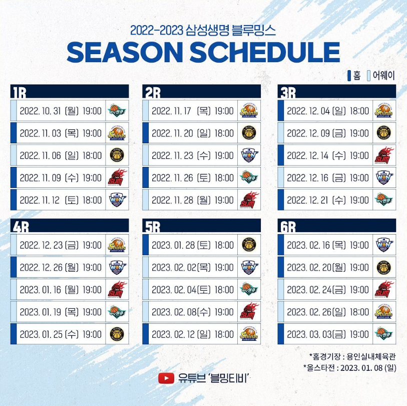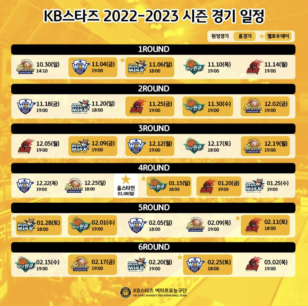 올해 여자농구 시즌은 1030() 인천에서 열리는 신한은행KB스타즈의 공식 개막전을 시작으로 팀당 30경기씩, 6라운드로 펼쳐집니다. 여자프로농구 정규리그는 202333일까지 진행되며, 311일부터 1~4위와 2~3위 간 플레이오프가 열립니다. 챔피언결정전은 319일부터 53선승제로 치러집니다. 별들의 전쟁 올스타전은 202318일로 예정되어있습니다.