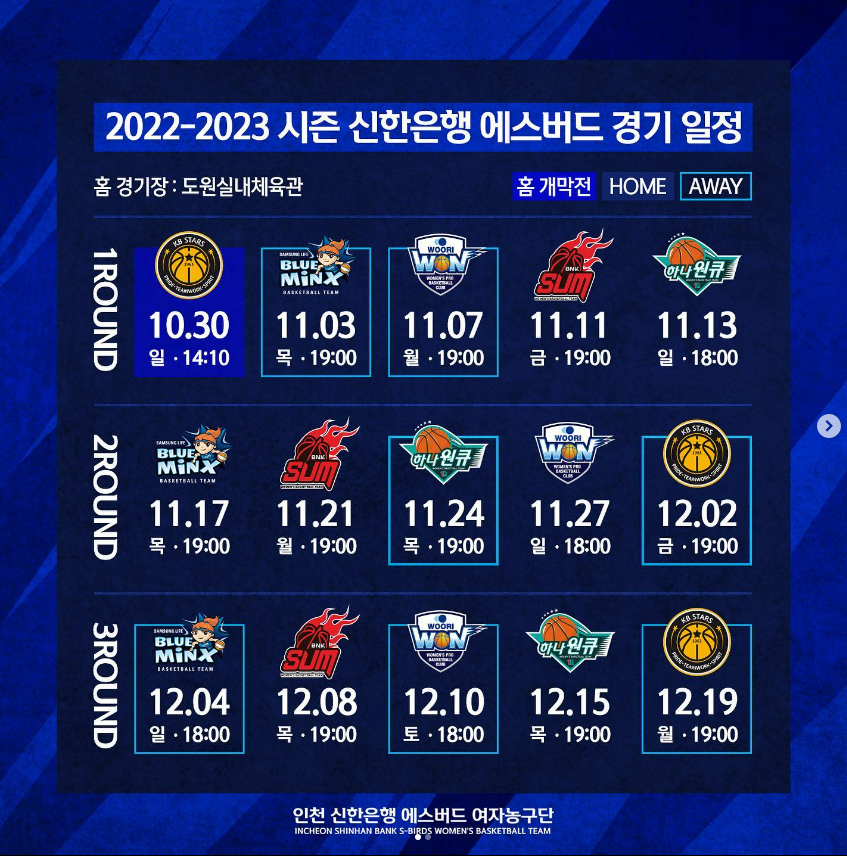 각 팀별 홈 개막전 중 하나원큐1031일 홈 개막전을 삼성생명과의 맞대결로 시작합니다. 삼성생명은 11월 3일 신한은행과 개막전을 치르고, 지난 시즌 통합 우승팀 KB스타즈114일 지난 시즌 챔피언결정전 상대 우리은행을 홈으로 불러 개막전을 펼칩니다. BNK썸은 11월 5일 하나원큐와 개막전을 치룹니다.