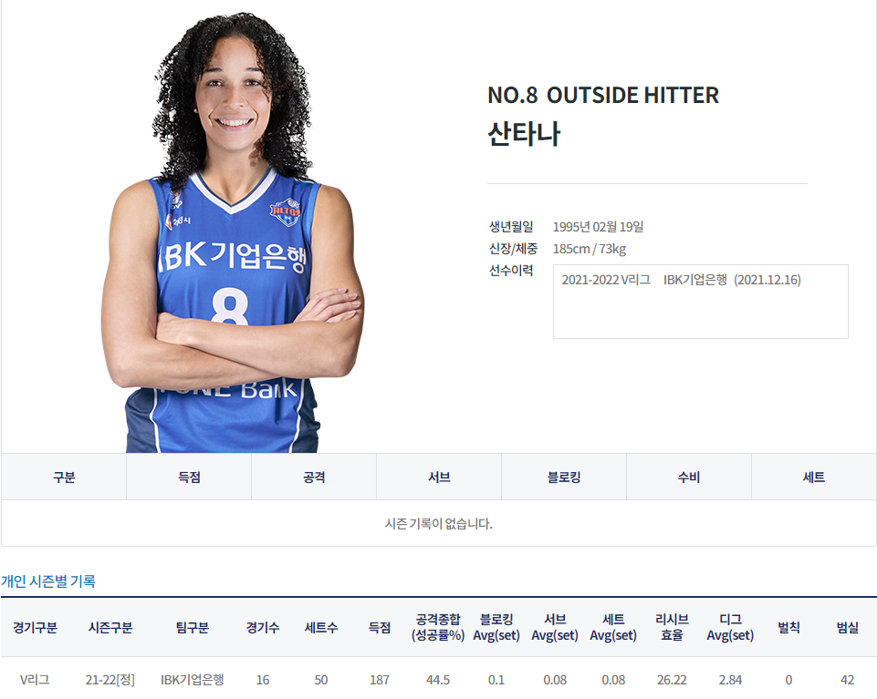 지난 시즌 중 레베카 라셈의 대체 선수로 기업은행에서 뛰었던 달리 산타나(27.푸에르토리코)는 2021-2022 시즌 16경기에 출전해 총 득점 187점, 공격성공률 44.5%, 블로킹 0.1, 서브 0.08, 범실 42개를 기록했습니다. 대체 선수로 들어온 초반에는 매우 고전하였으나 중반 이후 점점 나아지는 모습을 보였습니다. 5라운드 중반부터는 꾸준히 출장했으며 좋은 성적을 내기도 했습니다.