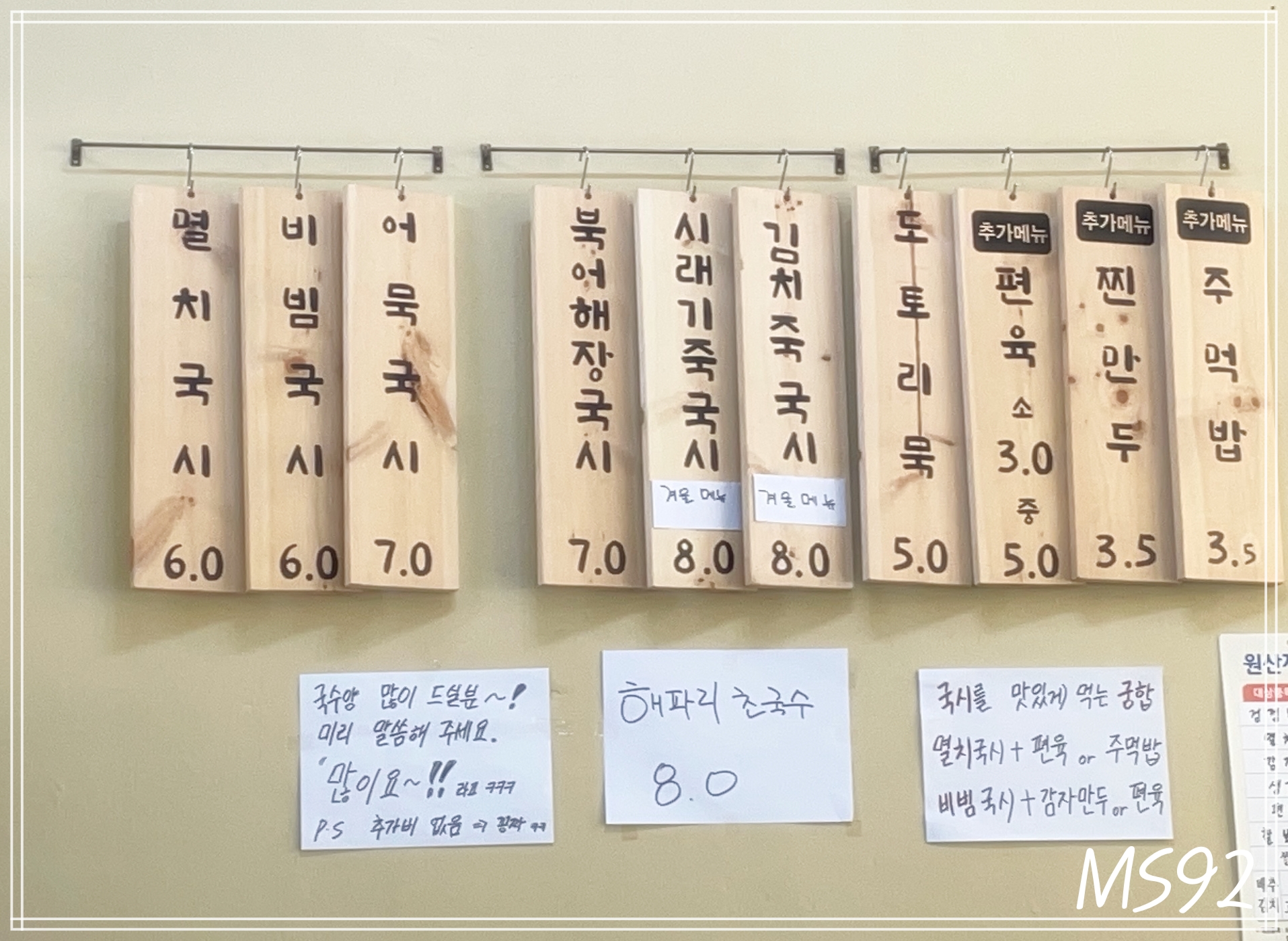 메뉴판 아래에 보면 A4용지에 '국수양 많이 드실 분 미리 말씀해주세요. 많이요 라고' 라는 종이가 붙어있는데 추가 비용 없이 주신다고 하니 양이 많으신 분들은 주문할 때 요청하면 좋을 거 같습니다.