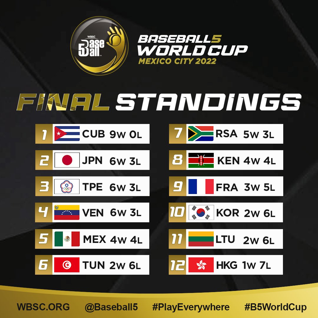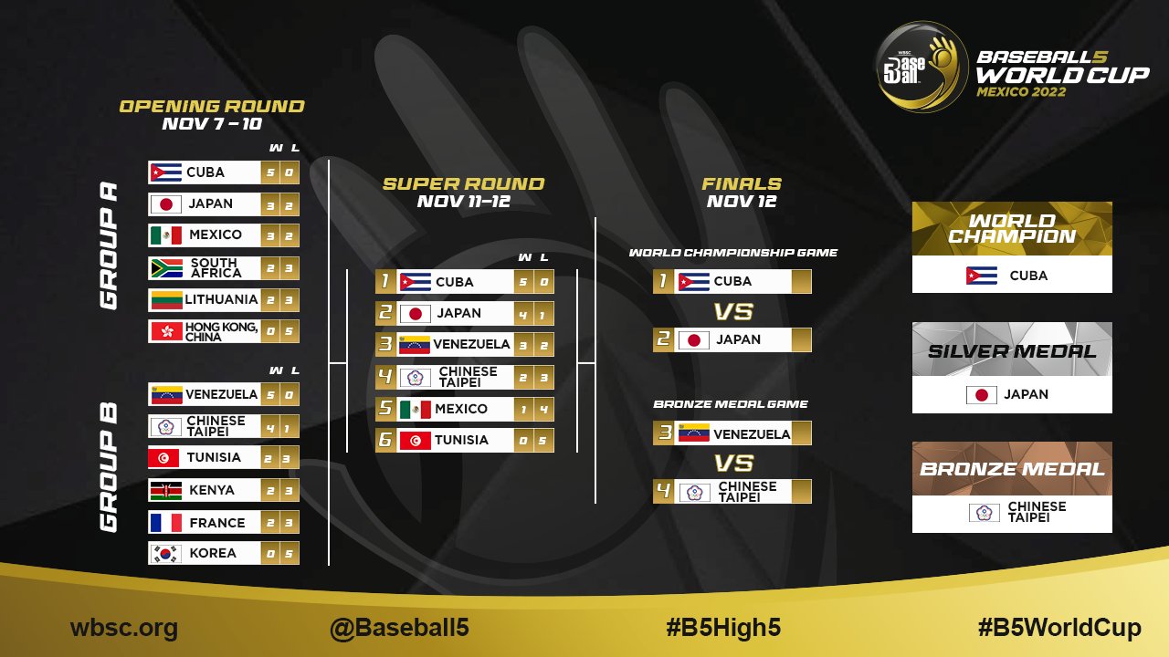 2022년에 처음 열린 WBSC 베이스볼5 월드컵은 11월 7일부터 13일까지 12개국이 참가한 가운데 멕시코에서 개최되었습니다. 2022 WBSC 베이스볼5 월드컵은 세계야구소프트볼연맹(WBSC)이 베이스볼5 종목을 출범한 뒤 개최한 첫 번째 대회로, 우리나라는 지난 8월 말레이시아 쿠알라룸푸르에서 개최된 2022 베이스볼5 아시아컵에서 3위에 입상해 월드컵 진출권을 획득했습니다.