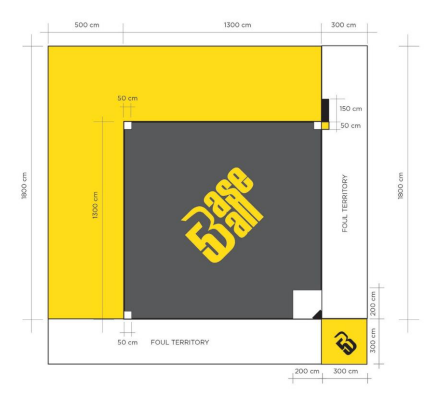 내야는 정사각형 모양으로 각 코너마다 1, 2, 3, 본루(홈베이스)의 베이스가 있습니다. 두 베이스 사이의 거리는 각각 13m입니다. 타격은 홈 플레이트 바로 뒤에 있는 타석 박스 안에서 실시합니다.