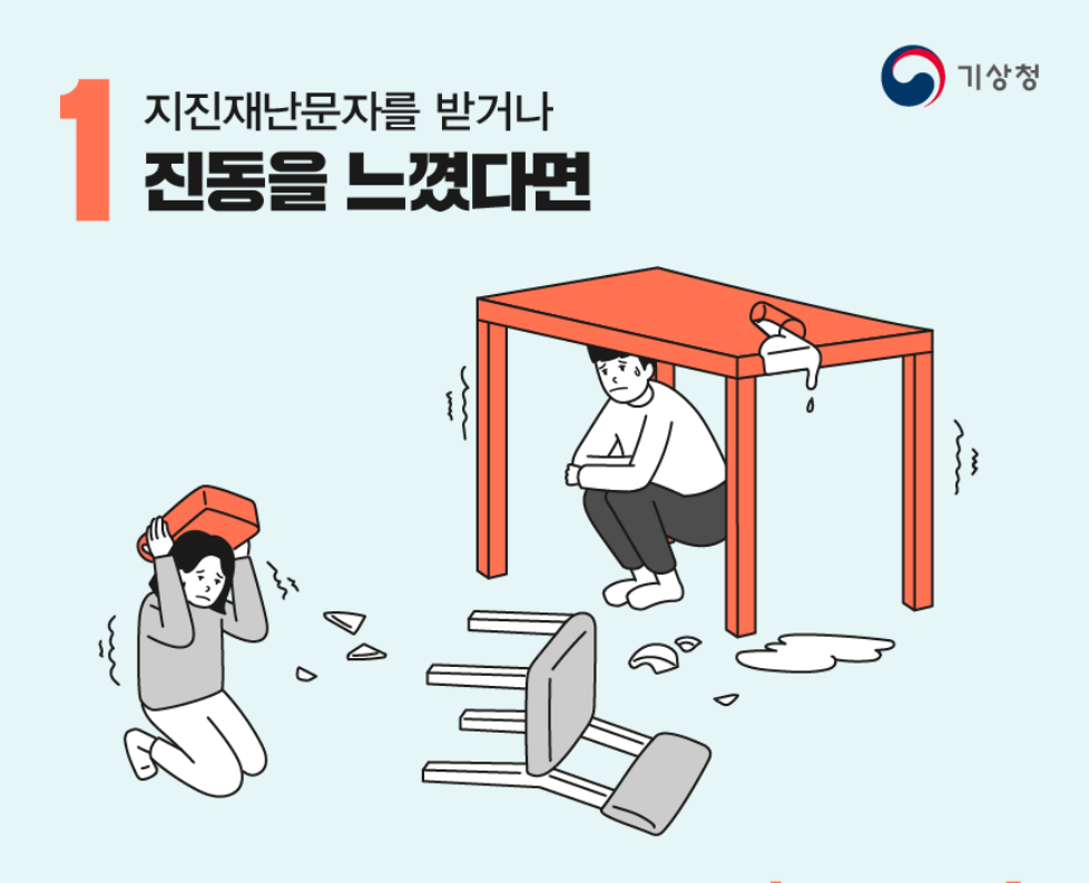 1) 지진재난문자를 받거나 진동을 느꼈다면 → 책이나 방석으로 머리를 감싸고, 책상 밑으로 숨습니다.