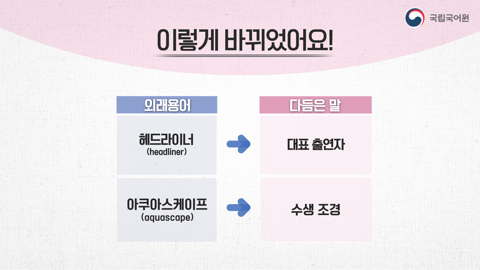 문화체육관광부와 국립국어원은 11월 4일(금)부터 10일(목)까지 국민 2천여 명을 대상으로 ‘어려운 외국어에 대한 우리말 대체어 국민 수용도 조사’를 실시한 결과, 응답자의 68.9%가 ‘헤드라이너’를 쉬운 우리말로 바꾸는 것이 좋다고 응답했습니다. 또한 ‘헤드라이너’를 ‘대표 출연자’로 바꾸는 데 응답자의 82.5%가 적절하다고 응답했습니다. ‘헤드라이너’는 행사나 공연 등에서 가장 기대되거나 주목받는 출연자 또는 그 무리를 이르는 말입니다.
