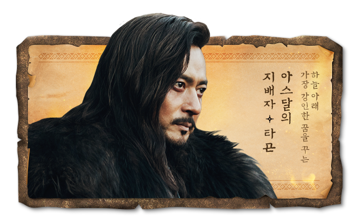아스달 연맹장인 산웅의 첫째 아들이며, 천재적인 전략가이며 문무를 겸비한 군검부의 무장이자, 대칸부대의 수장입니다. 뇌안탈과의 대전쟁을 승리로 이끈 영웅입니다뇌안탈과의 대전쟁 이후, 연맹장 산웅은 최후의 한 마리까지 말살하라는 뇌안탈 대사냥을 선포했고, 타곤은 기꺼이 대사냥에도 앞장서서 자신의 능력을 증명했습니다. 타곤이 지휘하는 대칸부대의 무력은 뇌안탈 뿐만 아니라, 반란을 일으킨 변방의 부족들에게까지 미쳤습니다. 아스달 내에서 타곤의 성망은 높아져만 갔습니다. 타곤이 모든 부족의 영웅이 되어가자 그의 친 아버지 산웅이 그를 불안한 시선으로 보기 시작합니다. 결국 권력욕에 사로잡힌 산웅은 타곤을 치기 위한 덫을 놓게 되고, 이 일은 아버지와 아들의 전쟁을 초래하며 타곤은 아버지 산웅을 뛰어넘고 아스달을 차지하려 합니다.