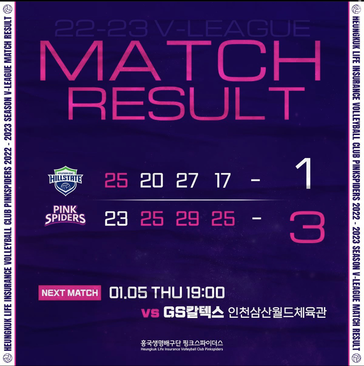 | 흥국생명 | 23 | 25 | 29 | 25 | - | 3 |