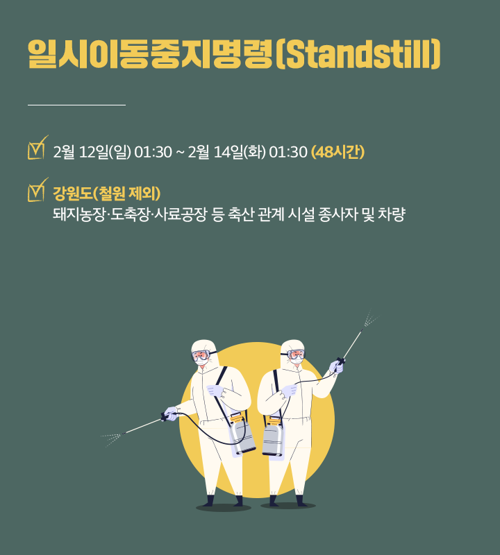 - 농장에 출입하는 차량에 대한 2단계 소독(고정식 소독시설+고압분무 소독), 축사 출입 시 전실에서 전용 장화 갈아신기 및 손 소독 실시 등 기본 방역수칙을 반드시 준수해야 합니다.
