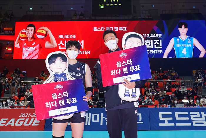 세트 사이사이엔 올스타전만의 특별한 이벤트와 시상도 준비되어 있습니다. 가장 먼저 본 경기 시작 전 올스타 팬 투표 1위 시상이 진행됩니다. 남자부에선 한국전력 신영석이, 여자부에선 흥국생명 김연경이 올스타 최다 팬 투표의 영예를 안았습니다.
