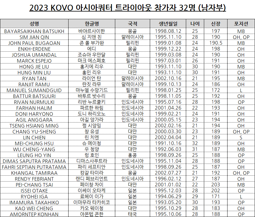 1. 2023 KOVO 아시아쿼터 트라이아웃 참가자 남자부(32명)