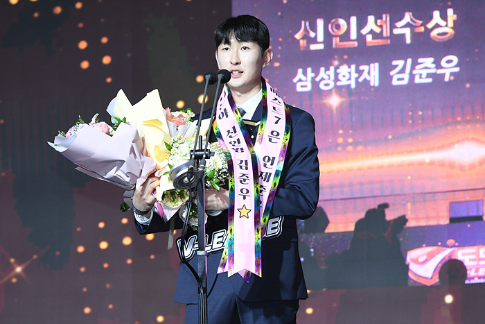 남자부에서는 삼성화재 미들블로커 김준우가 생애 첫 신인상 수상의 영예를 안았습니다. 1라운드 3순위로 삼성화재 유니폼을 입고 프로에 데뷔한 김준우는 블로킹 6(세트당 0.543), 속공 10(53.17%)로 팀의 중앙을 책임졌습니다. 삼성화재가 신인상을 배출한 것은 2019-20시즌 정성규(우리카드)에 이어 3시즌 만이자 구단 역대 두 번째입니다. 김준우는 18표로 신인상 경쟁자였던 현대캐피탈 세터 이현승(13)을 따돌렸습니다.