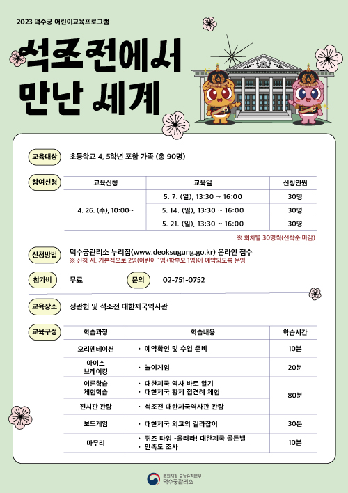 이번 프로그램 교육 신청은 덕수궁관리소 누리집(www.deoksugung.go.kr)에서 4월 26일(수) 오전10시부터 선착순으로 진행하며, 초등학생4~5학년 대상으로 회당 30명씩 총 90명(어린이1명 당 보호자1명 동반 필수)이 참여할 수 있습니다.참가비는 무료(덕수궁 입장료 별도)이며,더 자세한 사항은 덕수궁관리소(☎02-751-0752)로 문의하면 됩니다.