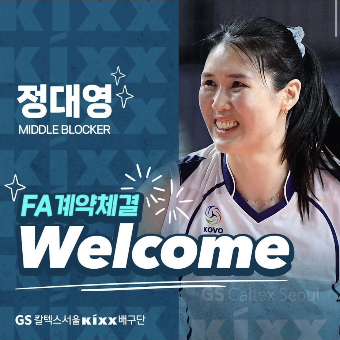 GS칼텍스는 한국도로공사의 우승을 이끈 베테랑 미들블로커 정대영을 9년 만에 복귀시켰습니다. 정대영은 3억 원(연봉 2억 5000만 원, 옵션 5000만 원)의 1년 계약을 맺었으며, 내부 FA 문명화, 한수진을 각각 9000만 원(연봉 7500만 원, 옵션 1500만 원) 규모의 1년 계약으로 잔류시켰습니다.
