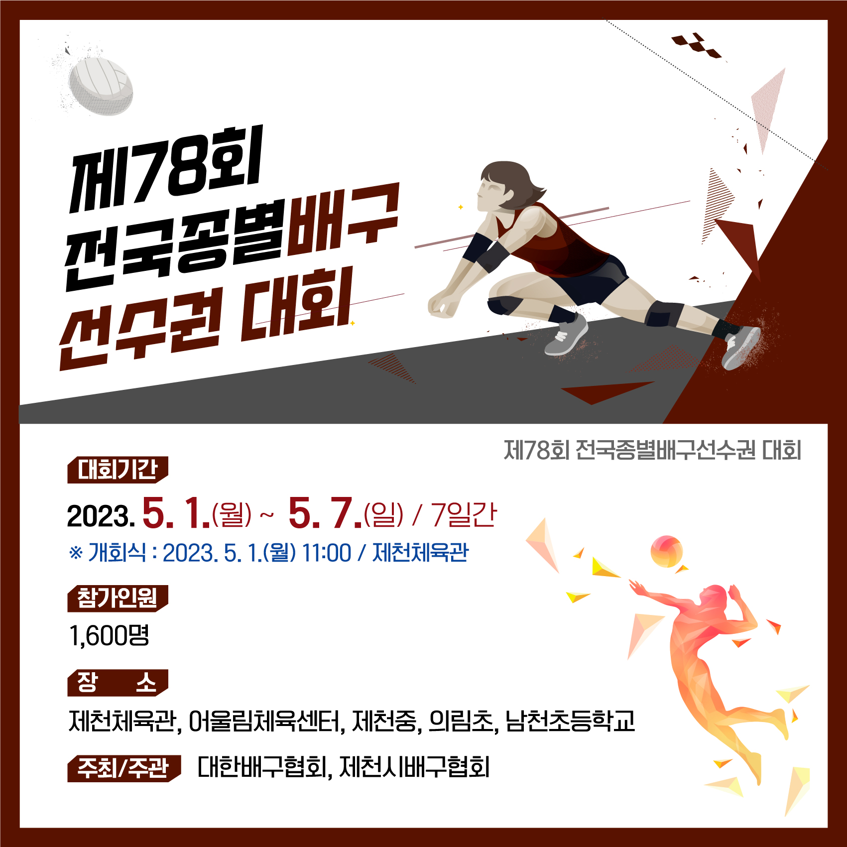 대한배구협회가 주최하고 제천시가 후원하는 제78회 전국종별배구선수권대회가 5월 1일부터 7일까지 일주일간의 일정으로 충청북도 제천시 제천체육관과 어울림 체육센터, 체육중학교 등에서 열립니다.