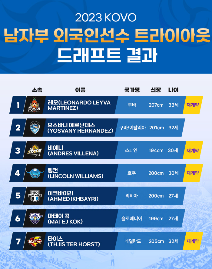 | 2023 남자프로배구 아시아쿼터 트라이아웃 선수 선발 결과 및 선수 소개 (0) | 2023.04.27 |