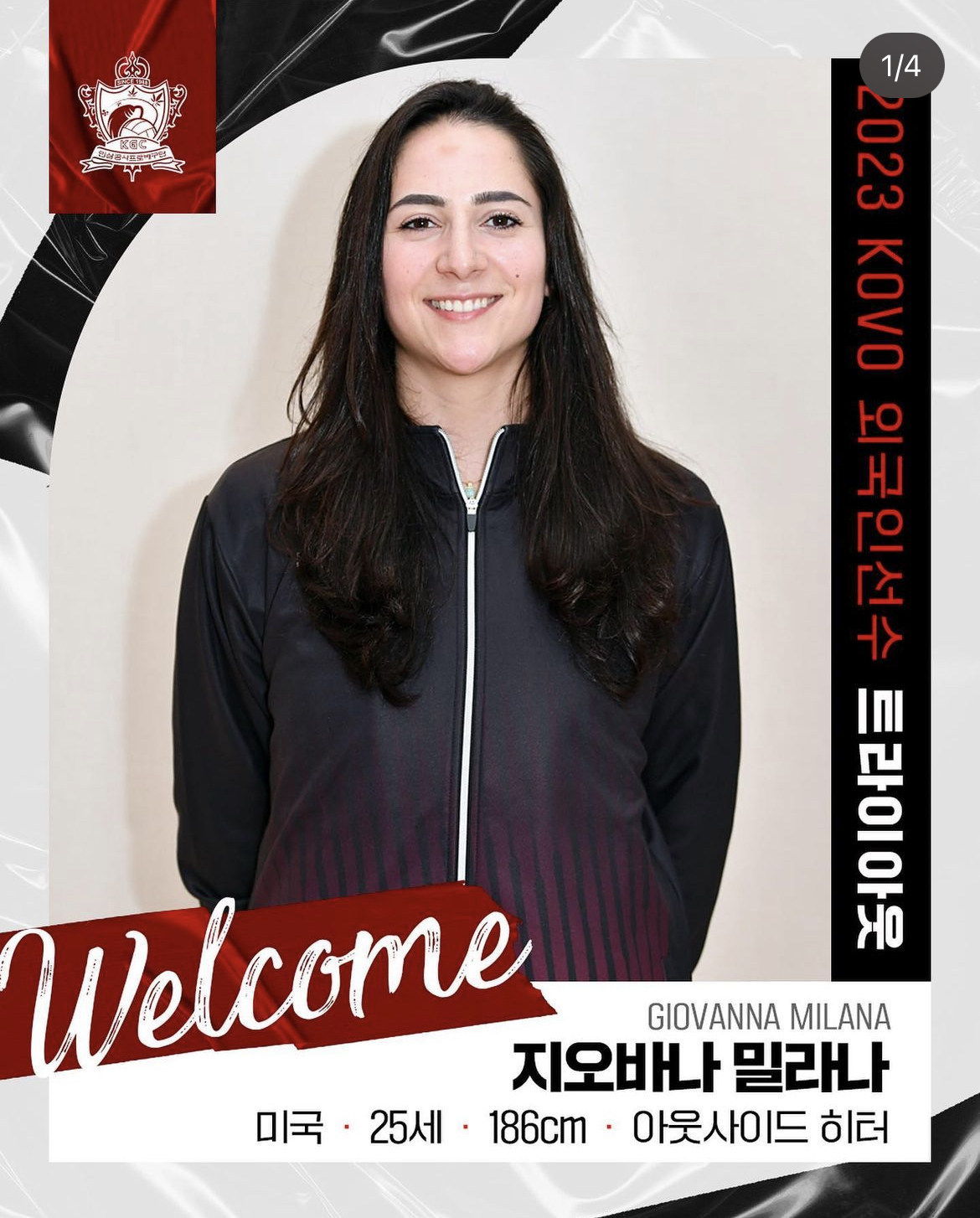 3순위 지명권을 얻은 흥국생명이 옐레나와의 재계약을 선택한 가운데 지난해 득점왕 엘리자벳 이네 바르가와의 재계약에 실패한 KGC인삼공사는 4순위 지명권으로 미국 국적의 지오바나 밀라나를 지명했습니다. 이탈리아 22부 리그에서 활약했던 밀라나는 이번 드래프트에서 선발된 선수 중 유일한 아웃사이드히터로 어깨 수술을 받은 이소영이 시즌 초반 결장할 경우 왼쪽에서 활약하게 될 확률도 있습니다.