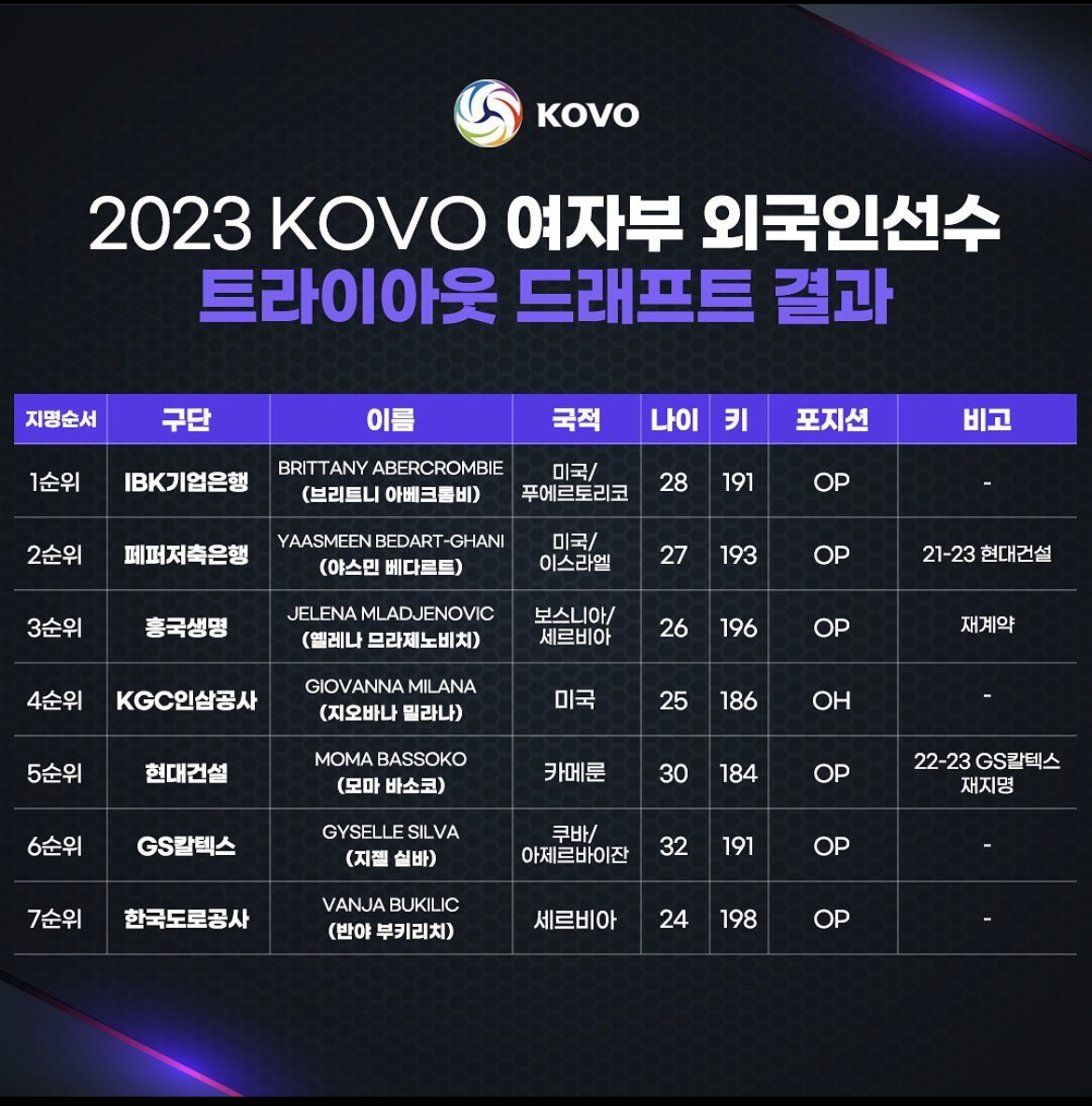 2022-2023 시즌 도로공사를 두 번째 우승으로 이끌며 챔프전 MVP까지 휩쓴 캐서린 벨과의 재계약을 포기한 '디펜딩 챔피언' 도로공사는 세르비아 출신의 아포짓 스파이커 반야 부키리치를 지명했습니다. 198cm로 이번에 지명된 7명의 선수 중에서 가장 신장이 좋은 부키리치는 트라이아웃 당시부터 2020-2021 시즌 GS칼텍스의 트레블을 안겼던 메레타 러츠를 연상케 한다는 평가를 받았던 선수입니다. 하지만 마지막에 뽑힌 만큼 현장에서 타 구단이 선택하지 않은 이유가 있지 않을까 하는 팬들의 우려가 있습니다.