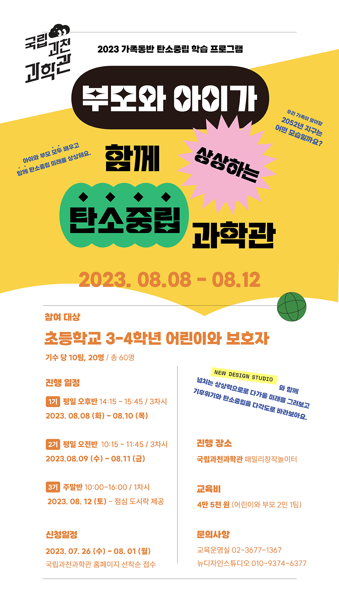 한편, 특별교육과정과 더불어 8월 8일부터 12일까지 가족 동반 수업인 ‘부모와 아이가 함께 상상하는 탄소중립 과학관’ 프로그램을 울산과학기술원(UNIST) 뉴디자인스튜디오와 공동으로 운영합니다.