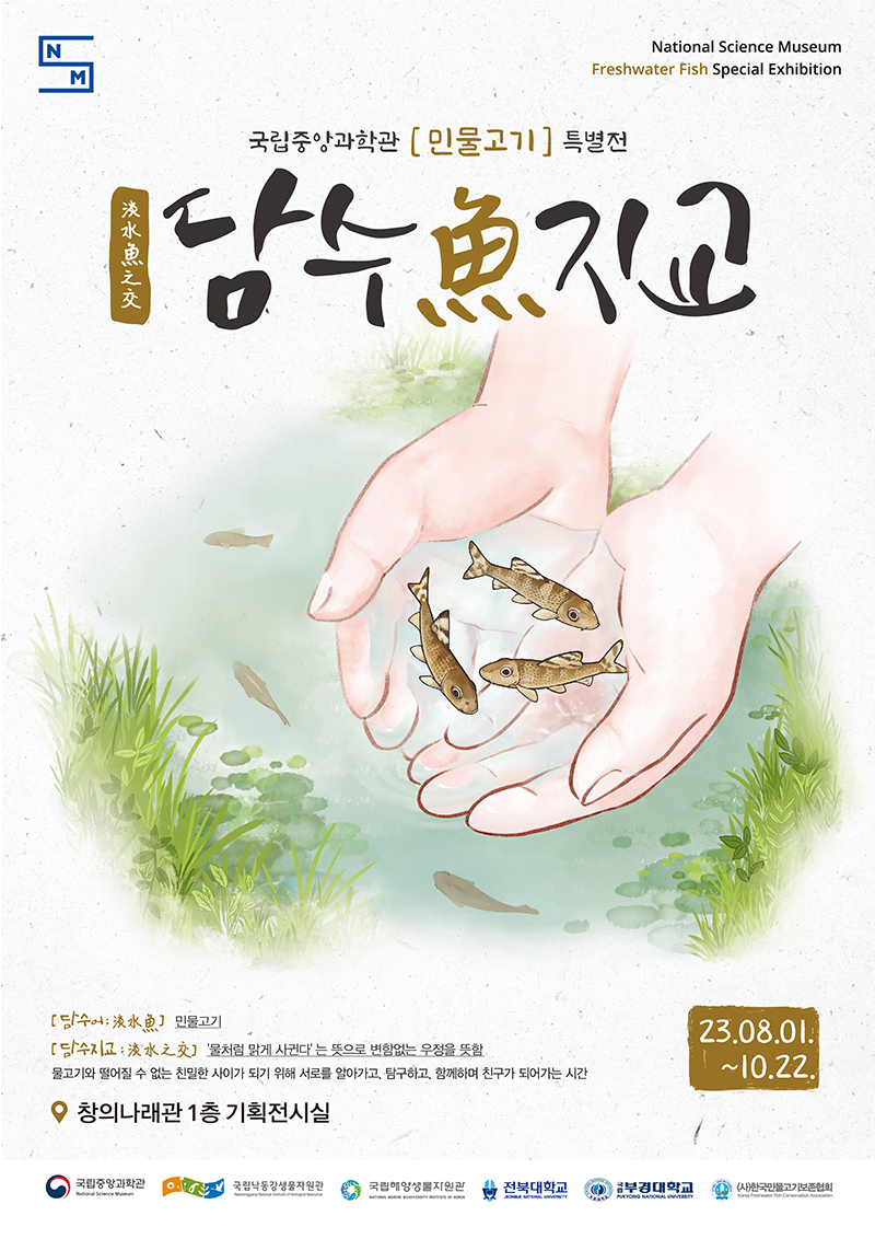 국립중앙과학관에서는 우리 주변 강과 하천에서 살아가는 민물고기를 주제로 민물고기 특별전을 준비했습니다. 우리 민물고기를 알아가고, 탐구하고, 함께하며 친구가 되기 위해 다양한 볼거리와 체험물, 전문가 특강을 준비했으니 방문해 주시기 바랍니다.