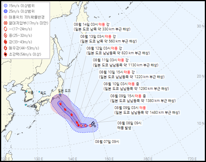 제6호 태풍 카눈이 8월 10일 오전 우리나라를 관통할 것으로 예측되고 있는 상황에서 일본 남서쪽 앞바다에서 제7호 태풍 란(LAN)이 추가로 발생했습니다.