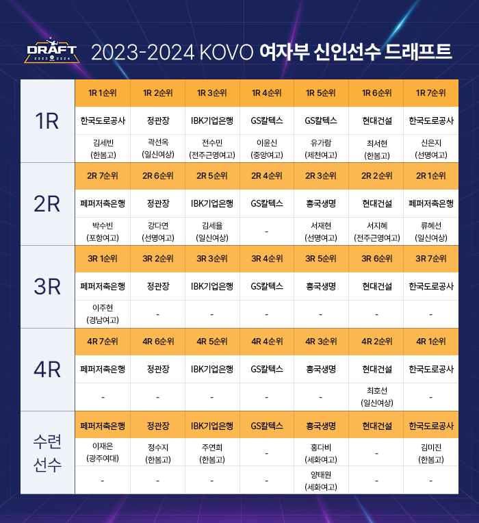 *확률추첨제 실시 : 페퍼저축은행(35), IBK기업은행(30), GS칼텍스(20), 정관장(8), 현대건설(4), 흥국생명(2), 한국도로공사(1)