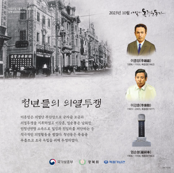 10월의 독립운동가로 조국의 독립을 위해 친일파 처단 등 의열 활동을 펼친 독립유공자, 이종암(1962년 독립장), 이강훈(1977년 독립장), 엄순봉(1963년 독립장) 선생이 선정됐습니다.