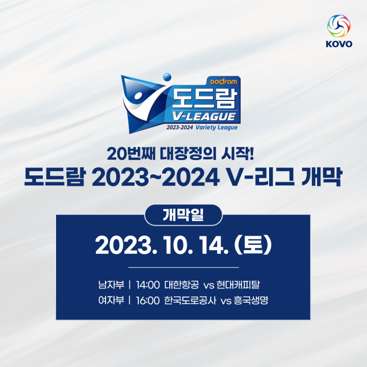 올해로 20번째 시즌을 맞이하는 도드람 2023-2024 V-리그의 개막이 다가왔습니다. 오는 10월 14일(토) 오후 2시 인천 계양체육관에서 대한항공과 현대캐피탈, 오후 4시 김천 실내체육관에서 한국도로공사와 흥국생명의 경기를 시작으로 6개월간 대장정의 막이 오릅니다.
