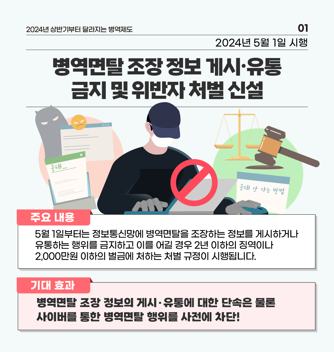 온라인상에서 속임수를 써서 병역면탈 행위를 하도록 수법을 게시하거나 유통하는 사람을 처벌할 명시적 규정이 없었으나, 5월부터는 정보통신망에 병역면탈을 조장하는 정보를 게시하거나 유통하는 행위를 금지하고, 이를 어길 경우 2년 이하의 징역이나 2,000만원 이하의 벌금에 처하는 규정이 시행됩니다.