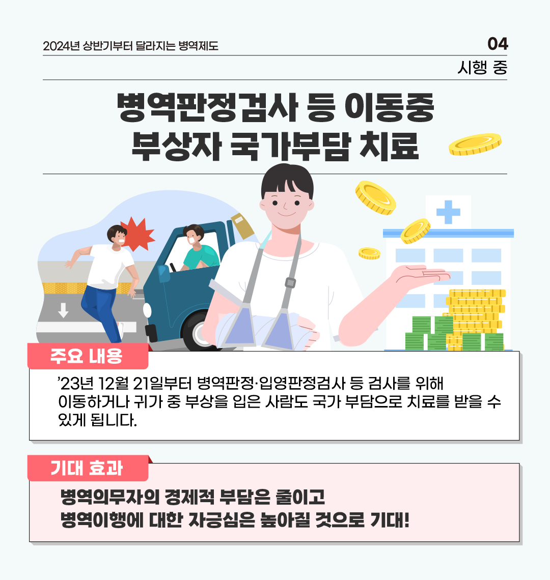 신체검사 또는 체력검사가 직접적인 원인이 되어 치료 등이 필요한 사람에 대해서만 국가부담으로 치료를 해 주던 것을, ’23.12.21.부터 병역판정·입영판정검사 등 검사를 위해 이동하거나 귀가 중에 부상을 입은 사람도 치료비를 지원하게 됩니다.