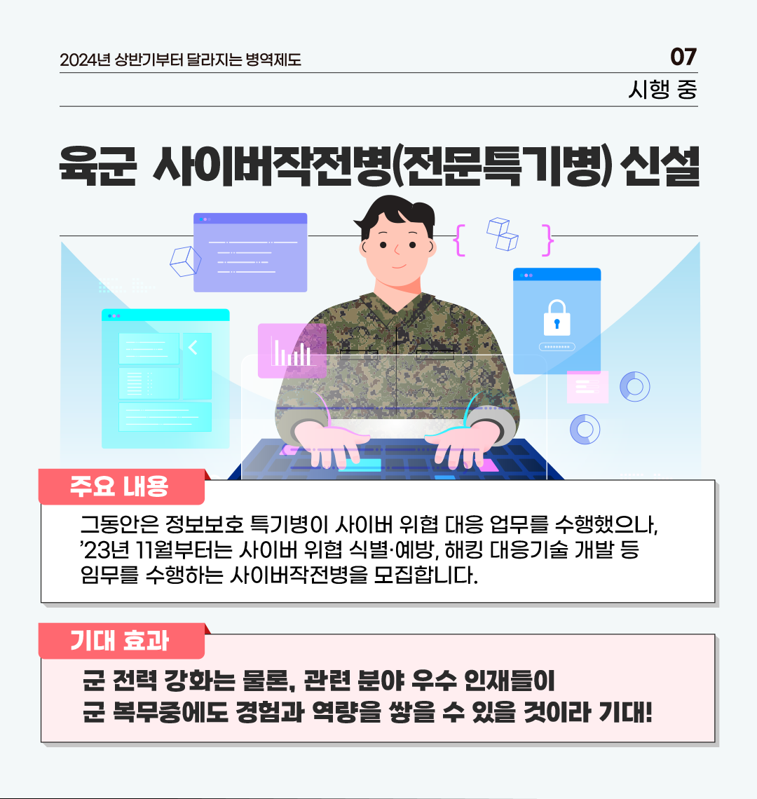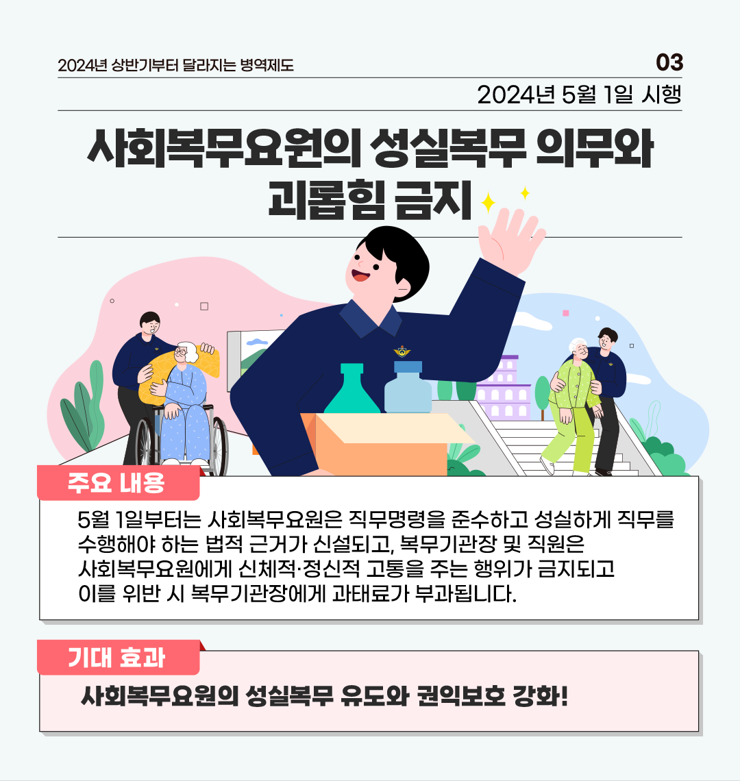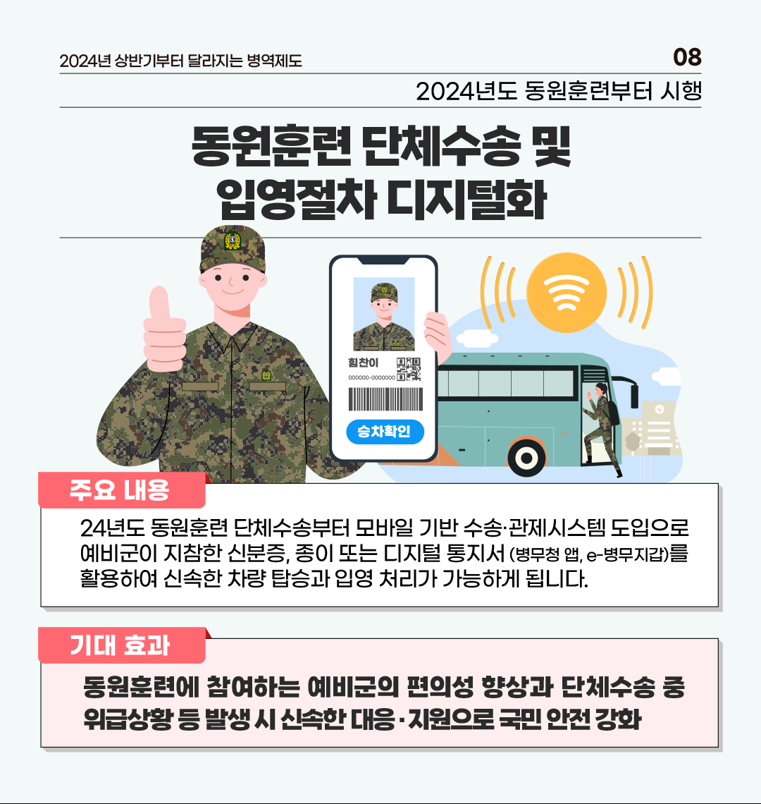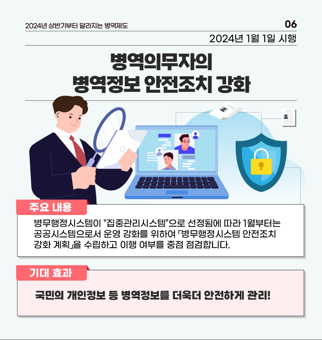 병역이행의 공정성을 제고하고, 국민 편익을 높일 수 있는 2024년 상반기부터 달라지는 병역제도의 상세내용은 병무청 누리집 ‘상단메뉴 → 병무소식 → 달라지는 제도’에 게재됩니다.