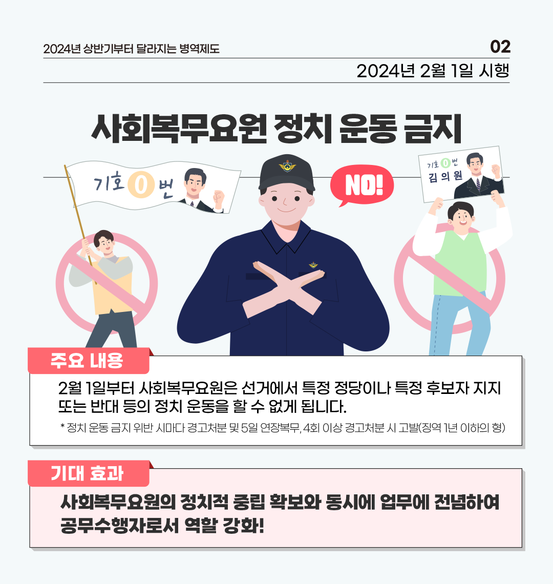 사회복무·대체복무요원의 정당가입 외에 정치적 행위를 제한할 수 없었으나, 2월부터는 선거에서 특정 정당이나 특정 후보자를 지지 또는 반대 등의 정치 운동을 할 수 없게 됩니다.