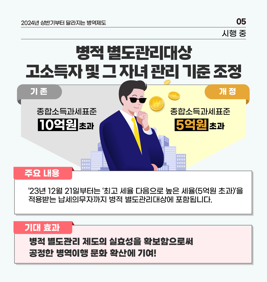 공정한 병역문화 조성을 위해 병적을 분류해서 따로 관리하는 병적 별도관리대상(공직자, 체육선수, 대중문화예술인, 고소득자 및 그 자녀) 중 고소득자 및 그 자녀의 관리 기준이 종합소득과세표준 10억원 초과자에서 5억원 초과자로 확대하여 시행 중입니다.(시행일 ’23.12.21.)