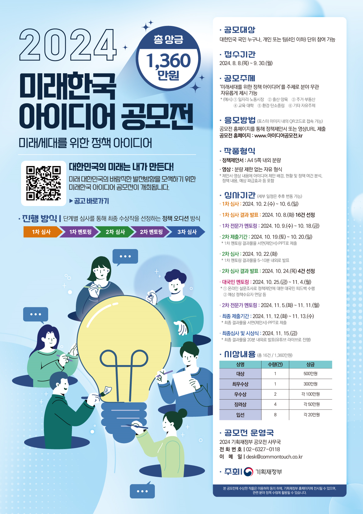 기획재정부는 급변하는 사회 속에서 대한민국의 미래 발전 방향에 대한 국민들의 참신한 정책제안을 발굴하기 위해 8.8.(목)부터 ‘2024 미래한국 아이디어 공모전’을 개최합니다.