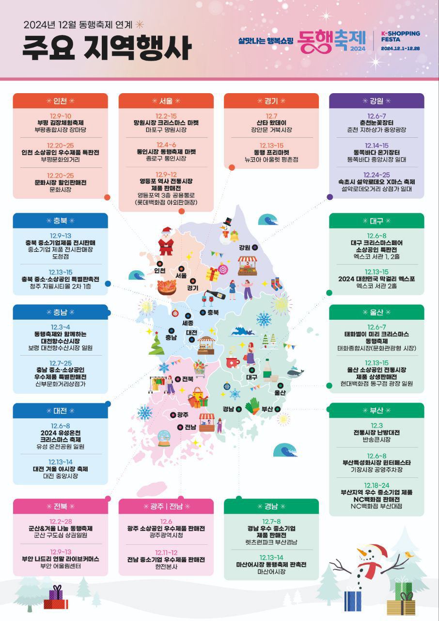 중소벤처기업부는 12월 1일(일)부터 28일(토)까지 전국적인 중소기업․소상공인 제품 소비 촉진 행사인 12월 동행축제를 개최합니다.