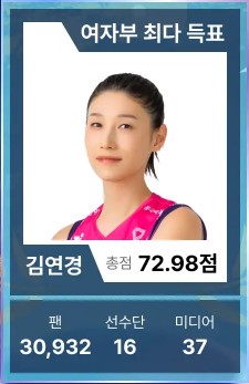 올스타전 팬투표에서 독보적인 건 역시 배구여제김연경(흥국생명)이었습니다. 남녀부를 통틀어 최고 총점을 받았습니다. 김연경은 전체 팬 투표 45,756표 중 30,932표를 얻어 20-21, 22-23, 23-24 올스타 팬투표에 이어 역대 네 번째로 남녀부 통합 최다 득표자가 됐습니다. 뿐만 아니다. 선수단과 미디어에서도 가장 높은 점수를 받은 김연경은 총점 72.98점으로 압도적인 영향력을 과시했습니다.
