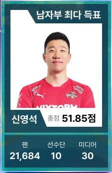 남자부에서는 신영석(한국전력)이 식지 않은 인기를 자랑했습니다. 신영석은 남녀부 통틀어 김연경에 이어 두 번째로 많은 팬 투표(21,684)를 받음과 동시에 선수단과 미디어 투표를 합산해 총점 51.85점으로 남자부 1위에 올랐습니다. 이로써 신영석은 통산 13번째로 이번 올스타 멤버 중 남자부 최다 출전자가 됐습니다. 여자부에서는 양효진이 통산 16번째로 올스타 무대를 밟게 됐습니다.
