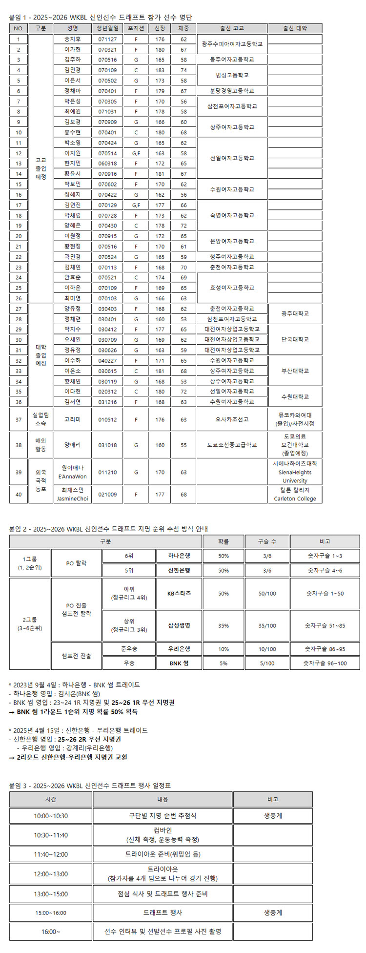 고교 졸업 예정자 선수 중에는 2025 FIBA(국제농구연맹) U19 여자농구 월드컵에서 한국을 세계 9위를 이끈 이가현(수피아여고), 최예원(삼천포여고), 홍수현(상주여고), 황윤서(선일여고), 김연진(숙명여고), 이원정(온양여고) 등 국가대표 출신 선수들이 다수 포함됐습니다. 2025 NBA 국경없는 농구 글로벌 캠프에 초대받은 황현정(온양여고), 우리은행 정채원의 친동생 정채아(분당경영고)도 눈에 띕니다.