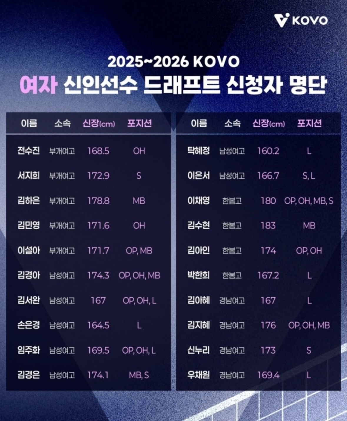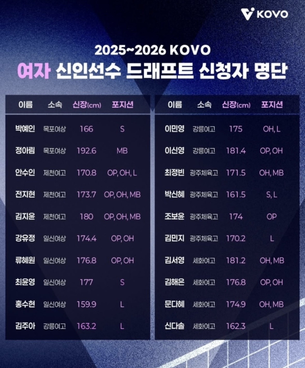 [2025-2026 KOVO 여자 신인선수 드래프트 신청자 명단]