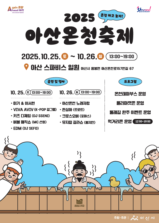 ○ 충청남도 아산시 아산스파비스 일대에서는 10월 25일(토)부터 10월 26일(일)까지 '제3회 아산온천축제'가 개최됩니다.