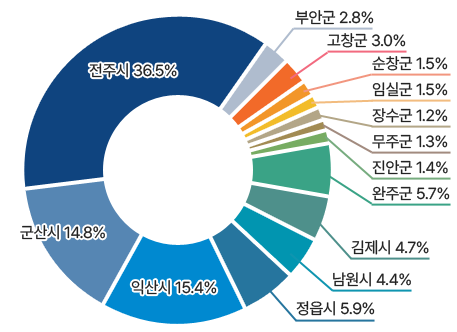 | 완주군 | 48,733 | 2,819 | 4,176 | 3,939 | 5,420 | 6,279 | 7,610 | 8,217 | 5,478 | 3,822 | 947 | 26 |
