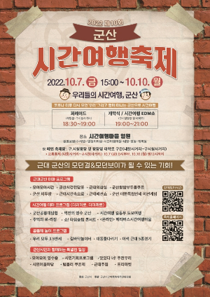 - 행사 소개 : 근대 군산으로의 시간여행을 시작으로, 시간을 되돌려 근대 이전 과거로 그리고 근현대를 지나 미래로의 시간여행 축제입니다. 군산시간여행축제는 10월 7일(금)~10월 10일(월) 구시청광장 및 시간여행마을 일원에서 개최되며 근대역사를 체험하고 수탈의 역사 속에서 항거했던 민족의 혼을 느끼며 다시 마음에 새기는 뜻깊은 시간을 가질 수 있습니다.