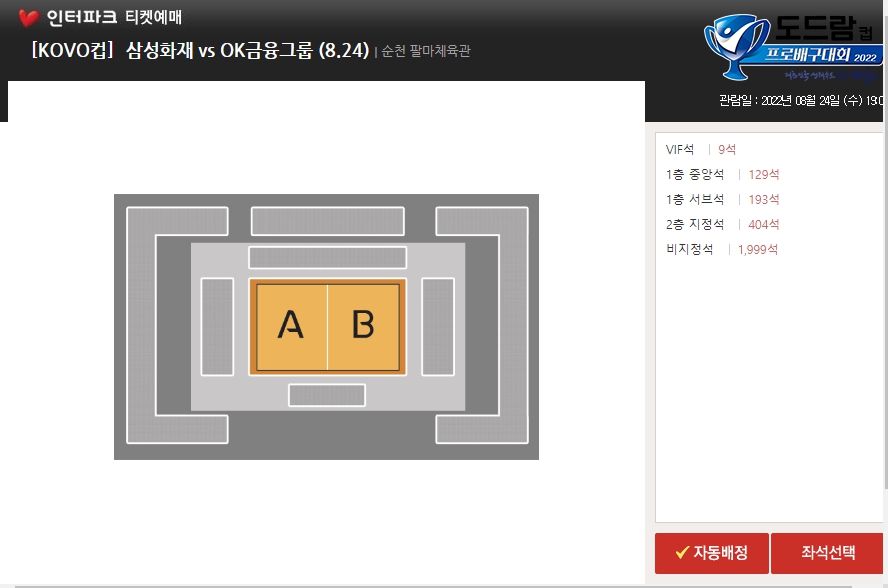순천 팔마체육관의 좌석수는 총 3,500석입니다. 그중 입장권(티켓) 온라인 예매분은 3300석이며, 온라인 예매에 실패한 배구팬들은 경기 당일 매표소에서 티켓을 구할 수 있습니다. 현장 판매분은 비지정석 200석입니다. 남자배구도 8월 21일부터 28일까지 같은 장소에서 개최됩니다.