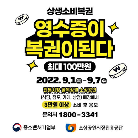 - 국내 전통시장·골목상권·소상공인 오프라인 매장에서 결제한 영수증만 가능하며 아래의 업종은 응모 불가능합니다.(사행성 업종, 약국, 성인용품 판매점, 일반유흥주점업, 무도유흥주점업, 부동산업, 성인용 게임장, 무도장 운영업 등)
